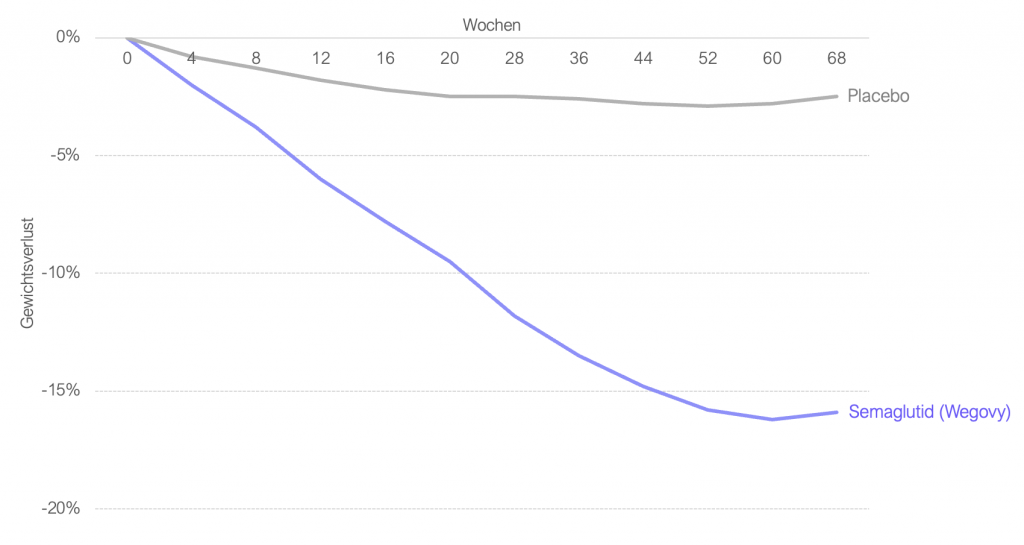 Die entscheidende Phase-III-Studie aus dem Jahr 2021 zeigte eine durchschnittliche Gewichtsreduktion in Höhe von 15 % über einen Zeitraum von 68 Wochen. Dies mündete in der Zulassung von Semaglutid unter dem Markennamen Wegovy zur Behandlung von Adipositas.