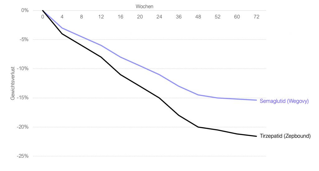 Kurz nach der Zulassung von Wegovy folgte der Wettbewerber Eli Lilly mit Tirzepatid (Markenname: Mounjaro/Zepbound), das in klinischen Studien sogar eine Gewichtsreduktion von über 20 % erzielte.