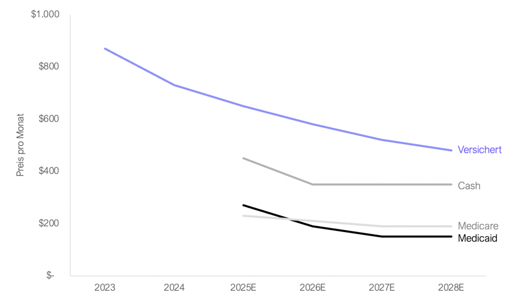 Das steigende Angebot und der zunehmende Wettbewerb führen inzwischen zu einem Preisverfall bei den Präparaten. So erwartet beispielsweise Goldman Sachs, dass sich die monatlichen Kosten für Wegovy in den USA bis zum Jahr 2028 nahezu halbieren werden.