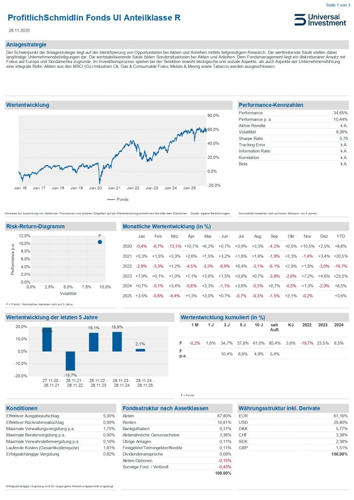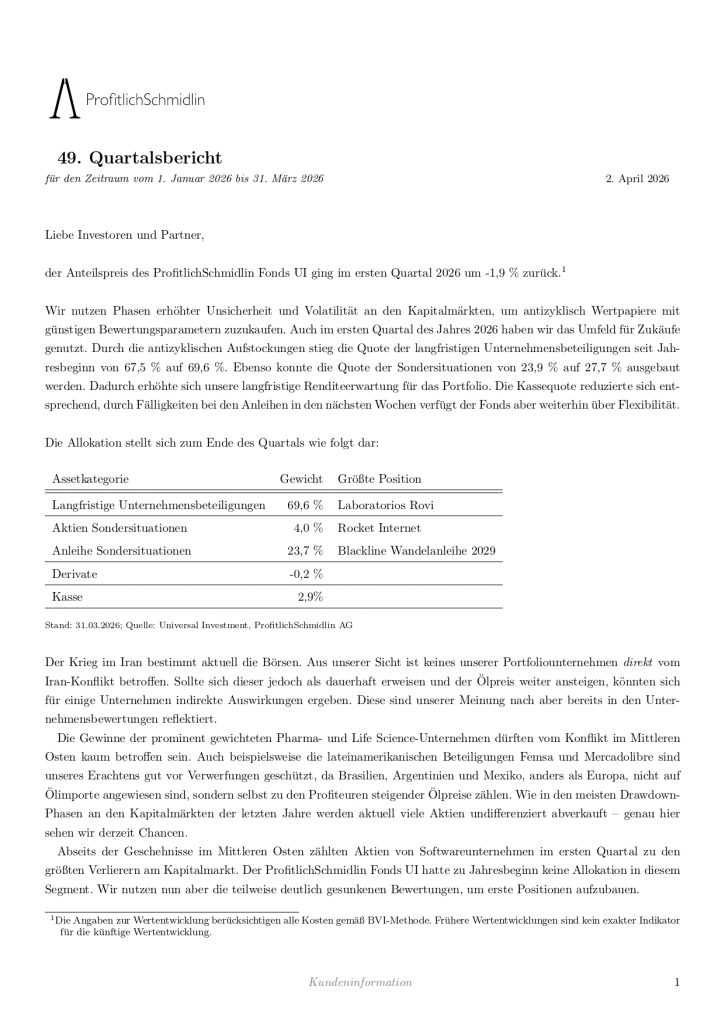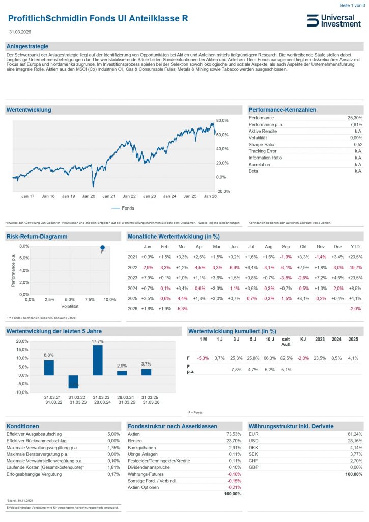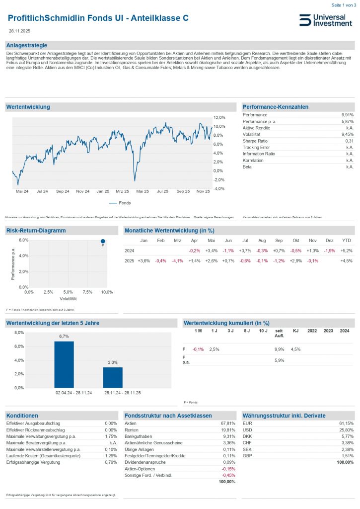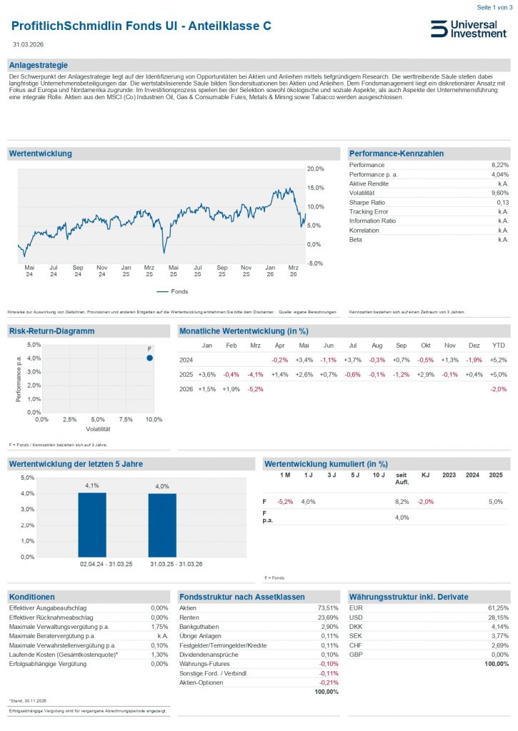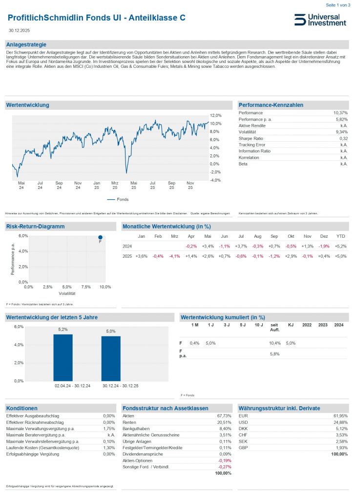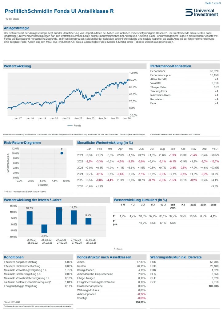 Der ProfitlichSchmidlin Fonds UI investiert in langfristige Unternehmensbeteiligungen sowie Aktien und Anleihen Sondersituationen.